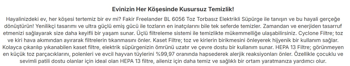 Fakir Toz Torbasız Elektrikli Süpürge Freelander Bl6056