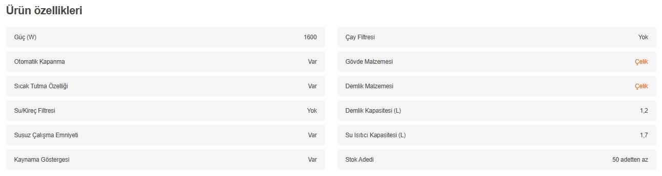 • Çay filtresi : Yok