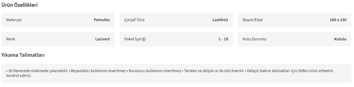 Nevresim: 160x220 cm (1 Adet), Çarşaf: 180x260 cm (1 Adet), Yastık Kılıfı: 50x70 cm (1 Adet),