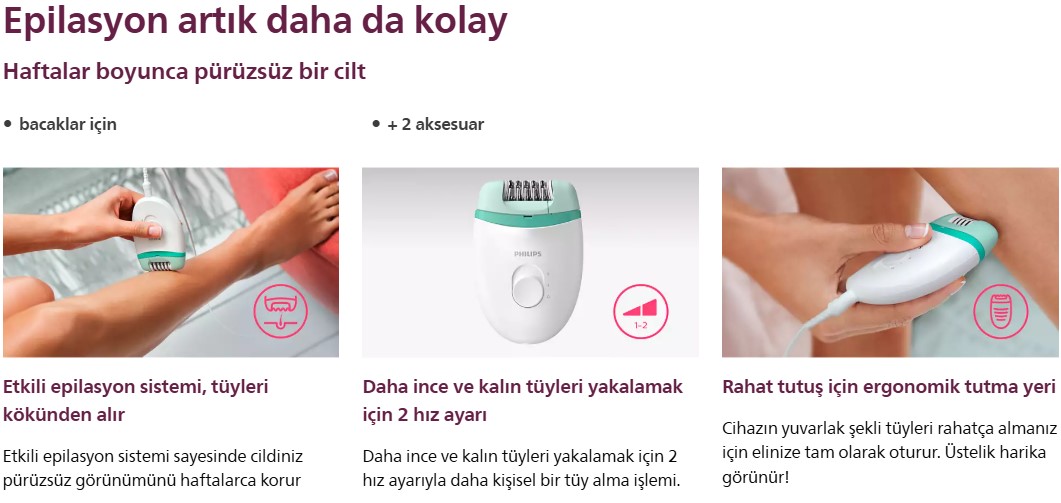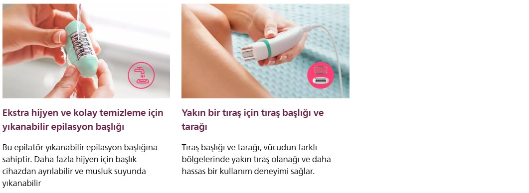 Ergonomik tutma yeri ve optimum hijyen için yıkanabilir başlık ile epilasyon artık çok daha kolay