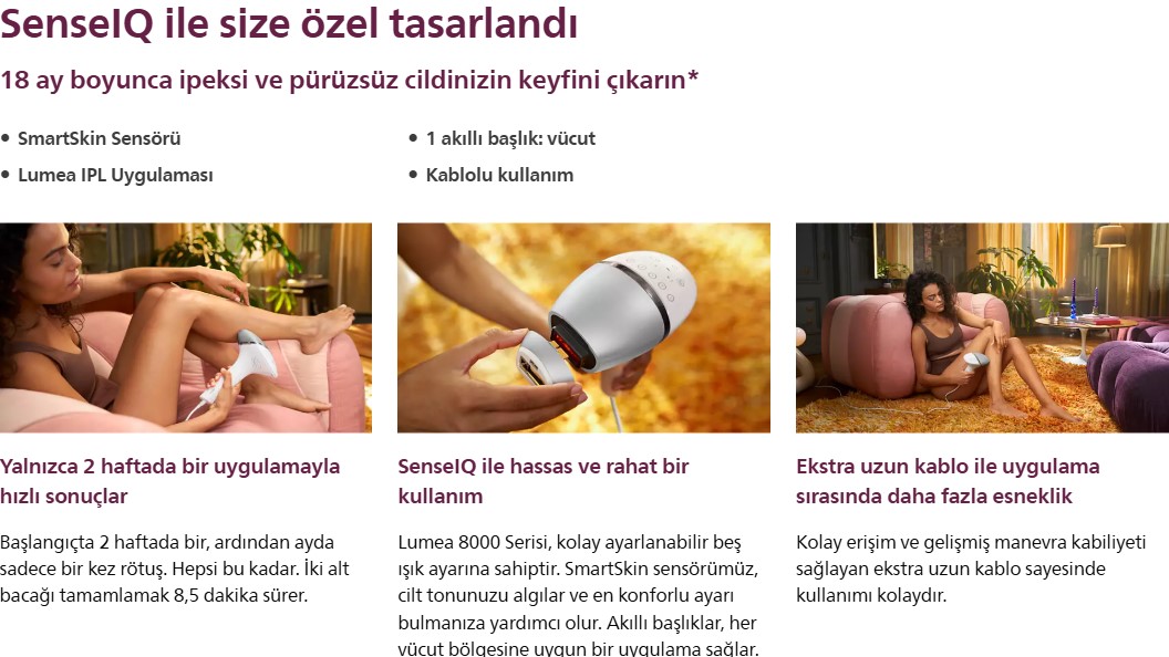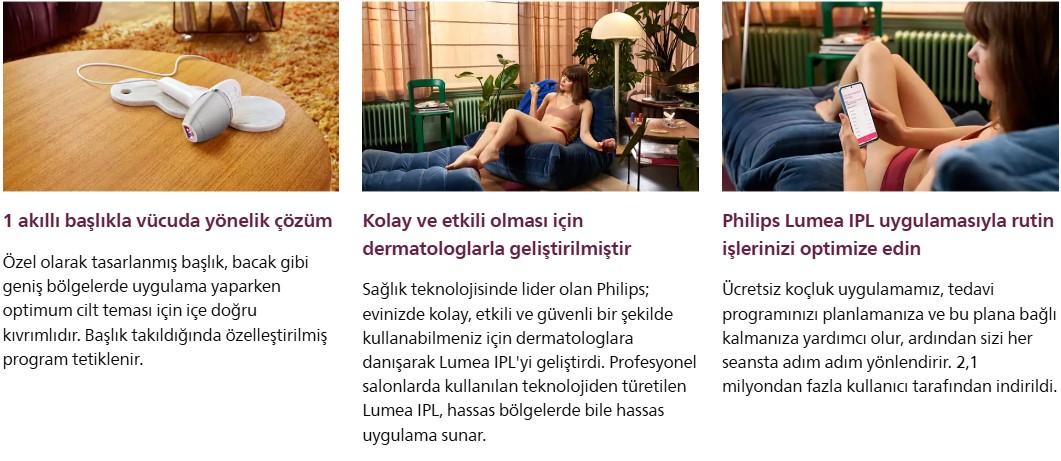 Yoğun Işık Atımı, tüylerinizi ortadan kaldırmak için hafif ışık kullanır. Işık, tüylerin köküne nüfuz eder ve zamanla yeniden çıkmasını altı aya kadar kademeli olarak engeller*. Lumea ile kadınlar, yalnızca 3 uygulamanın ardından aylarca süren pürüzsüzlük gözlemlemiştir.