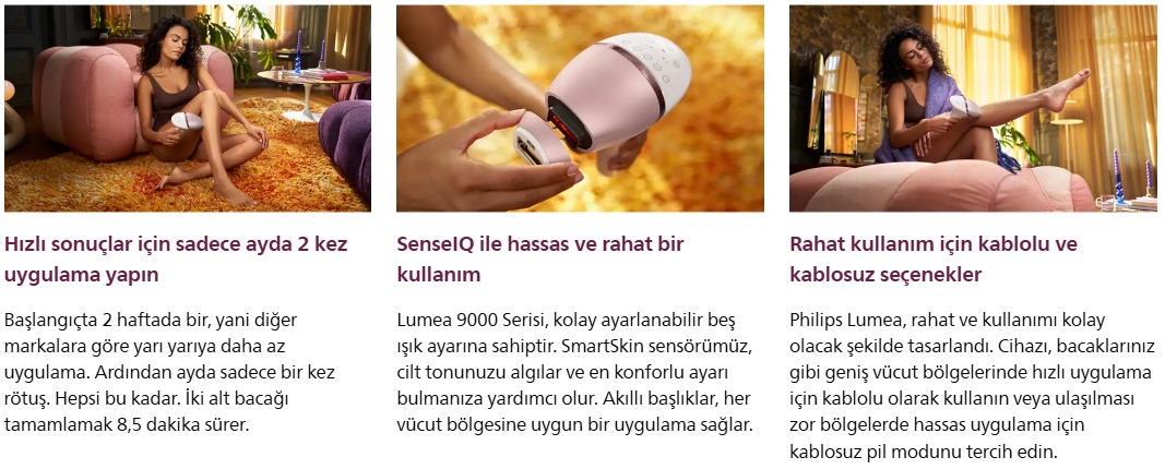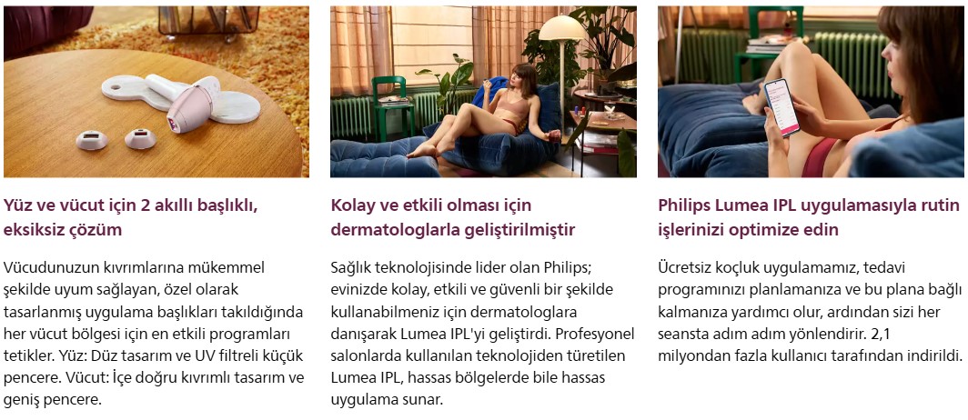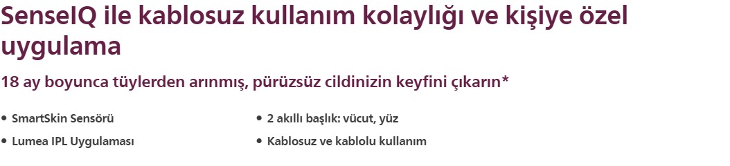 Akıllı başlıklara sahip SenseIQ teknolojisi ve Lumea IPL uygulamasında sunulan rehberlik sayesinde, cildiniz uzun süre pürüzsüz bir görünüme sahip olur.