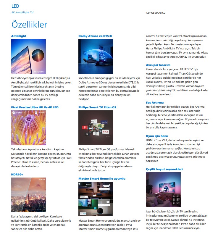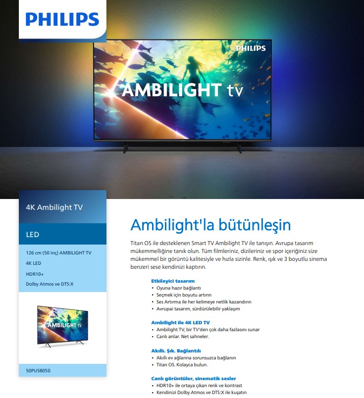 Phılıps Led Tv 50pus8050/62 4k Ultra Hd 126 Ekran Smart Ambilight
