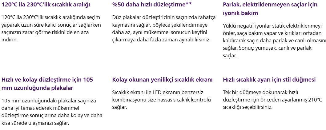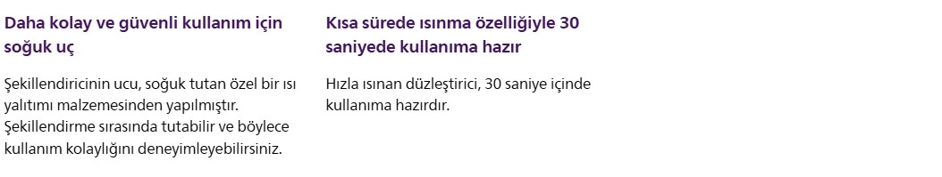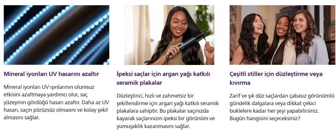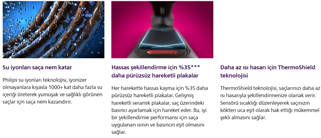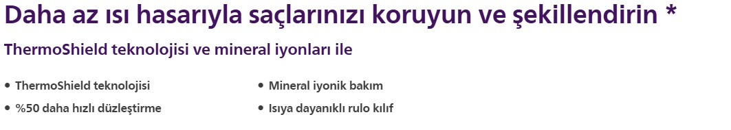 Güzel, sağlıklı görünen ve elektriksiz tarzlar için dengeli sıcaklıkla daha az ısı hasarı ve UV etkisini azaltma amaçlı mineral iyonlarına sahip ThermoShield teknolojisiyle saçlarınızı koruyun ve şekillendirin.
