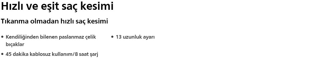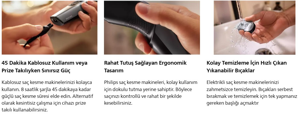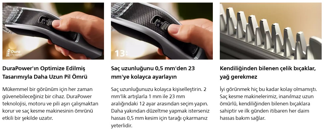 Philips Saç Kesme Makinesi 3000, hızlı ve eşit bir saç kesimi sağlar. Cihazın 13 uzunluk ayarı, Trim-and-Flow teknolojisi ve DualCut teknolojisi, hızlı bir şekilde eşit bir sonuç elde etmenizi sağlar.