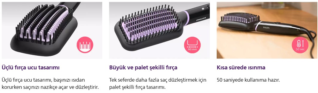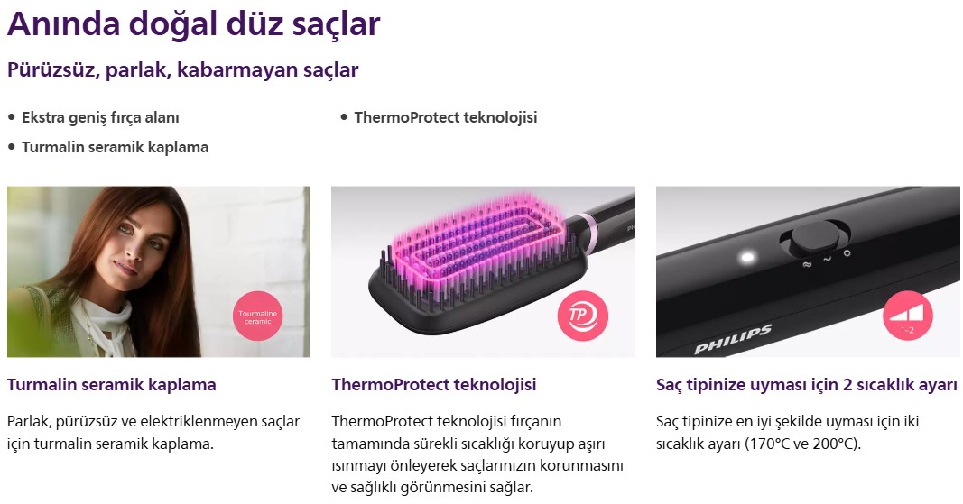 Philips Düzleştirici Tarak ile anında doğal düzlükte, harika parlaklıkta saçlara sahip olun.ThermoProtect teknolojimiz ve fırça ucu tasarımımız sayesinde saçlarınız sağlıklı görünür ve kabarmaz.