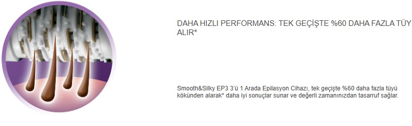 İpeksi ve pürüzsüz bir cildi özlediyseniz, 3’ü 1 Arada etkisi uzun süren bir epilasyonla size pürüzsüz dört hafta sunabilir. Daha hızlı bir performansla, tek geçişte %60 daha fazla tüyü kökünden alarak* sizi kısa sürede pürüzsüz bir cilde kavuşturur.