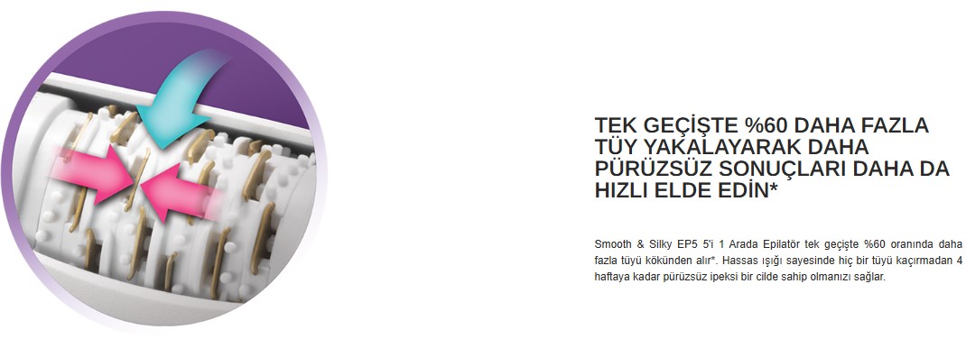 Uzun süre pürüzsüzlüğünü koruyan bir cilt istiyorsanız, Smooth&Silky EP5 5’i 1 Arada Epilasyon Cihazı tam size göre.