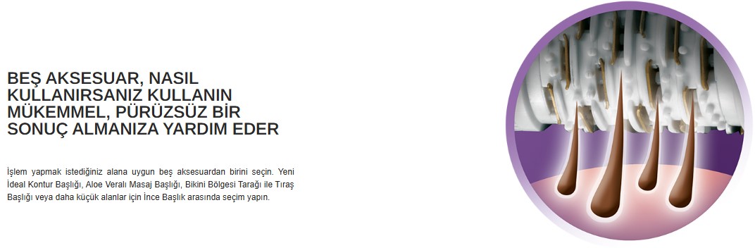Bikini Bölgesi Tarağı ile birlikte Tıraş Başlığının da yer aldığı beş farklı aksesuar arasından kendinize en uygun olanı seçebilirsiniz. En nazik epilasyon işlemi için Aloe Veralı Masaj Başlığı bile vardır.