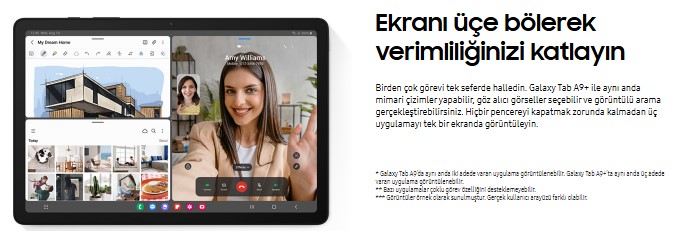 Birden çok görevi tek seferde halledin. Galaxy Tab A9+ ile aynı anda mimari çizimler yapabilir, göz alıcı görseller seçebilir ve görüntülü arama gerçekleştirebilirsiniz. Hiçbir pencereyi kapatmak zorunda kalmadan ili uygulamayı tek bir ekranda görüntüleyin.