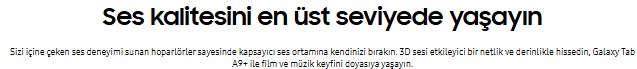 Sizi içine çeken ses deneyimi sunan hoparlörler sayesinde kapsayıcı ses ortamına kendinizi bırakın. 3D sesi etkileyici bir netlik ve derinlikle hissedin, Galaxy Tab A9+ ile film ve müzik keyfini doyasıya yaşayın.