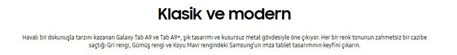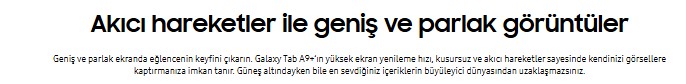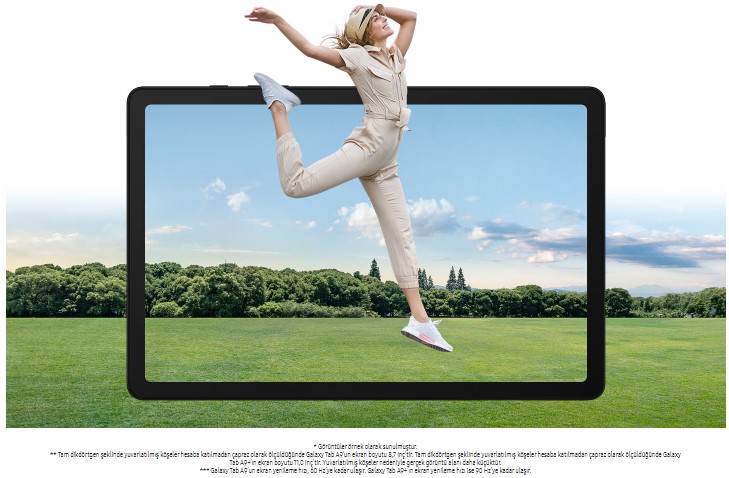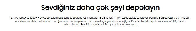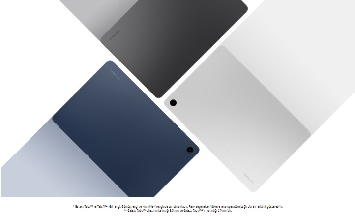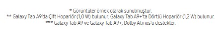 **** Galaxy Tab A9 ve Tab A9+ için iki farklı bellek ve depolama alanı seçeneği sunulur: 4 GB bellek ve 64 GB depolama alanı, 8 GB bellek ve 128 GB depolama alanı.