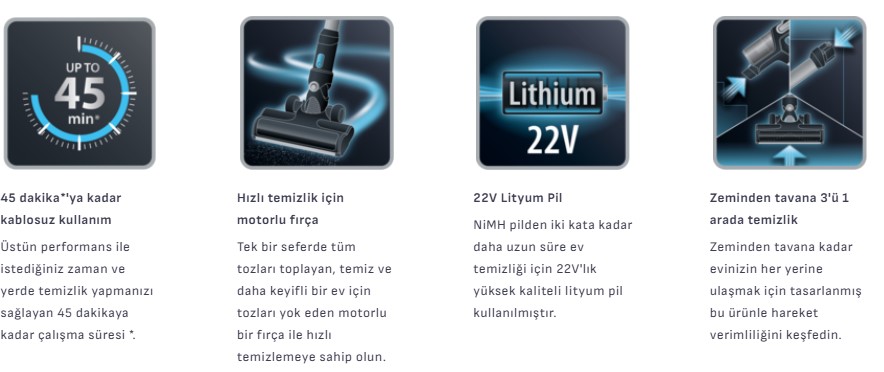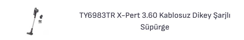 TY6983TR X-Pert 3.60 Kablosuz Dikey Şarjlı Süpürgenin çalışma süresi minimum 45 dakikadır.