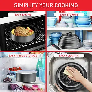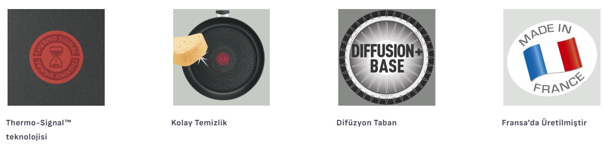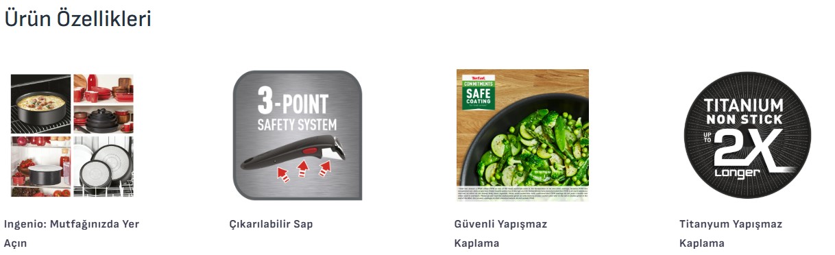 AZ YER KAPLAR ÇOK İŞ YAPAR: Ocaktan, fırına, sofraya, buzdolabına ve bulaşık makinesine, Ingenio ile yemek pişirmek çok keyifli ve kolay!, Alandan tasarruf ettiren ve iç içe geçen tasarımı sayesinde dolaplarınızda kolayca saklanabilir, Patentli, güvenli ve çıkarılabilen sapı 10 kg’ya kadar ağırlığı kaldırabilir** ve on yıl garantilidir***, KOLAY TEMİZLİK: Hem iç hem dış kolay temizlenebilir kaplama, GÜVENLİ VE UZUN ÖMÜRLÜ YAPIŞMAZ KAPLAMA: Titanium 2X kaplama standart Tefal kaplamalarına göre 2 kata kadar daha dayanıklıdır. Güvenli yapışmaz kaplama, PFOA, kurşun ve kadmiyum içermez**** /li>, Thermo-Signal:trade_mark: tavanız pişirmeye hazır olduğunda tamamen kırmızıya döner ve ideal zamanı size gösterir, OCAK UYUMU: İndüksiyon hariç tüm ocaklarla uyumludur, gaz, elektrik ve seramik, Difüzyon taban: Homojen pişirme deneyimi için, Fransa'da üretilmiştir.
