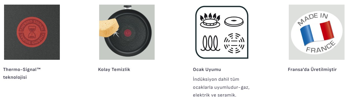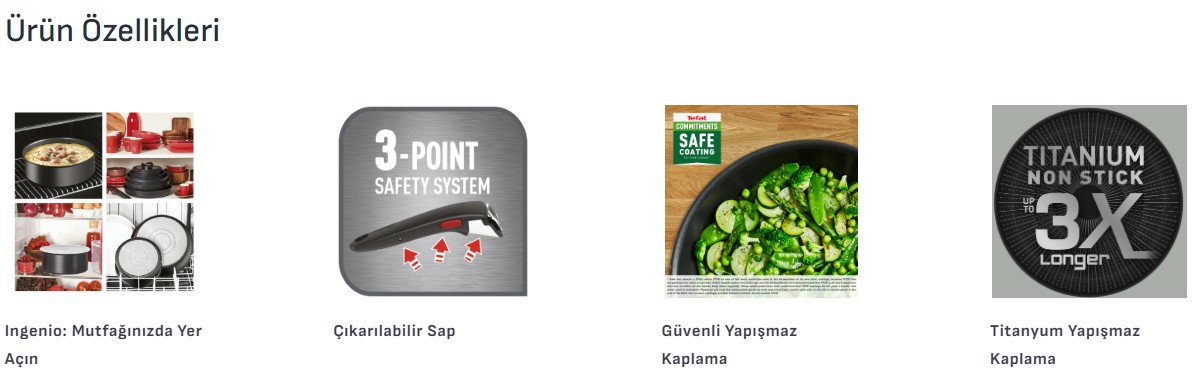 AZ YER KAPLAR ÇOK İŞ YAPAR: Ocaktan, fırına, sofraya, buzdolabına ve bulaşık makinesine, Ingenio ile yemek pişirmek çok keyifli ve kolay!, Alandan tasarruf ettiren ve iç içe geçen tasarımı sayesinde dolaplarınızda kolayca saklanabilir, Patentli, güvenli ve çıkarılabilen sapı 10 kg’ya kadar ağırlığı kaldırabilir** ve on yıl garantilidir***, KOLAY TEMİZLİK: Hem iç hem dış kolay temizlenebilir kaplama, GÜVENLİ VE UZUN ÖMÜRLÜ YAPIŞMAZ KAPLAMA: Titanium 3X kaplama standart Tefal kaplamalarına göre 6 kata kadar daha dayanıklıdır. Güvenli yapışmaz kaplama, PFOA, kurşun ve kadmiyum içermez**** /li>, Thermo-Signal:trade_mark: tavanız pişirmeye hazır olduğunda tamamen kırmızıya döner ve ideal zamanı size gösterir, OCAK UYUMU: İndüksiyon dahil tüm ocaklarla uyumludur, gaz, elektrik ve seramik, indüksiyon, İNDÜKSİYON TABAN: Homojen pişirme deneyimi için, Fransa'da üretilmiştir.