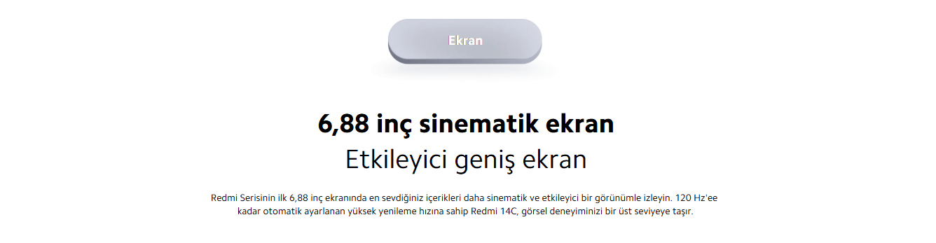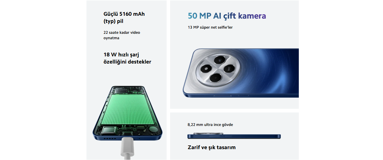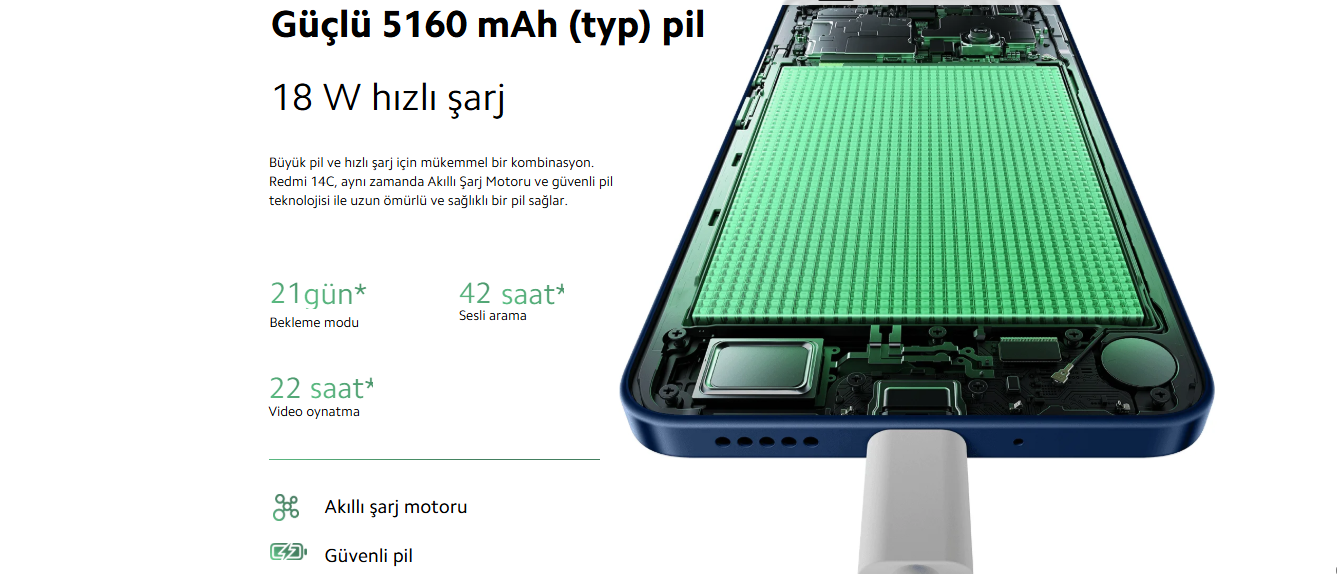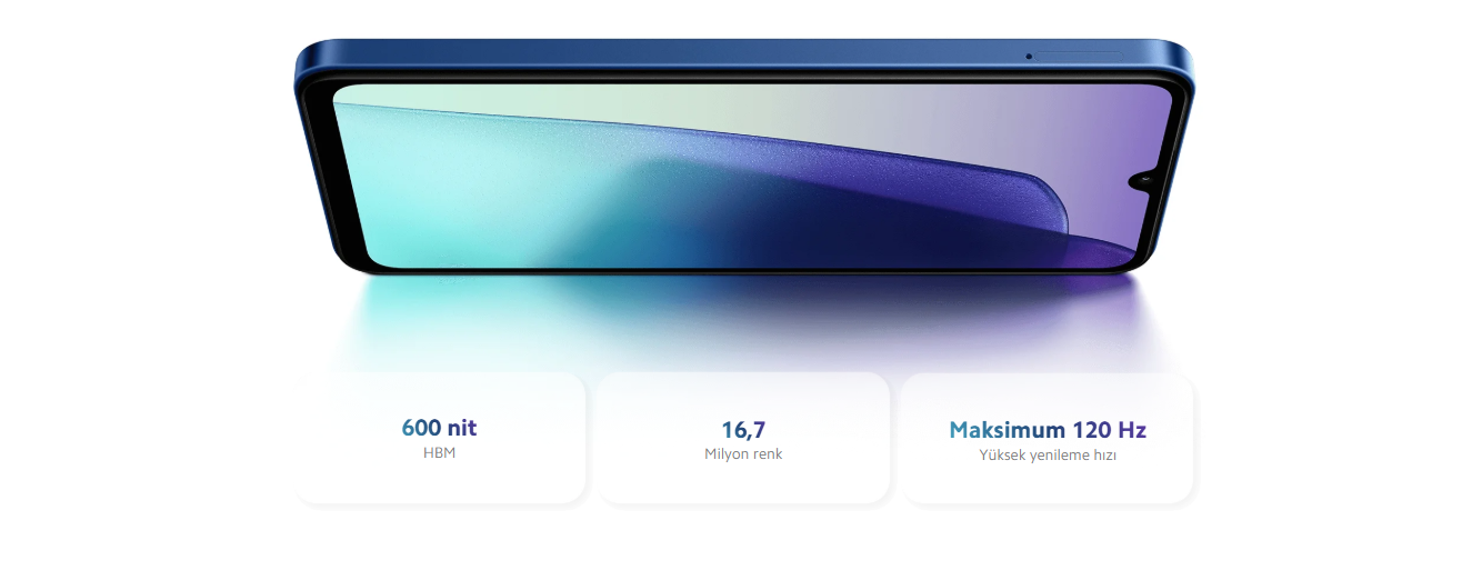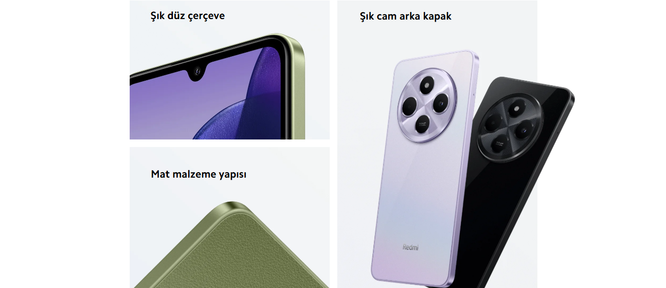 alınmıştır.*Veriler Redmi 13C ile karşılaştırılmıştır.*Xiaomi HyperOS özelliklerinin, uygulamalarının ve hizmetlerinin kullanılabilirliği, yazılım sürümüne ve telefon modeline bağlı olarak değişebilir.*Siyah ve Lila renklerde camlı arka tasarım.