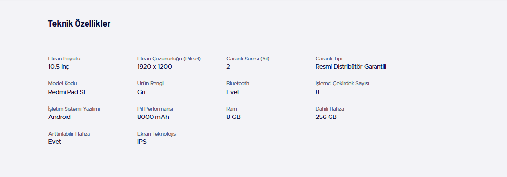 Xıaomı Tablet Redmı Pad Se 8 Gb Ram 256 Gb Hafıza 11 Inc